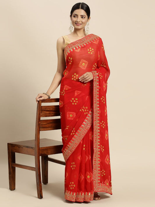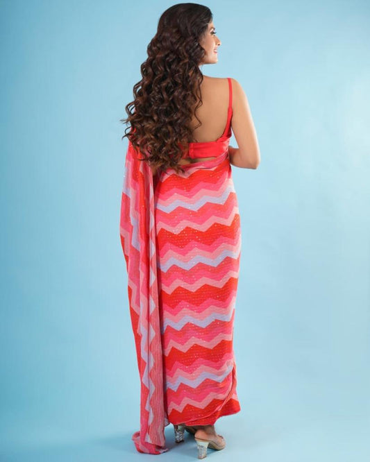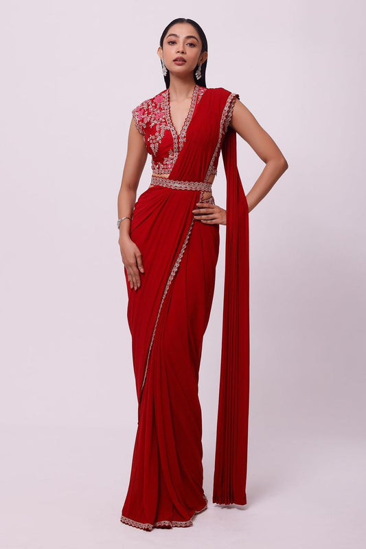 Maroon Georgette Floral Embroidered Blouse And Pre-draped Saree Set