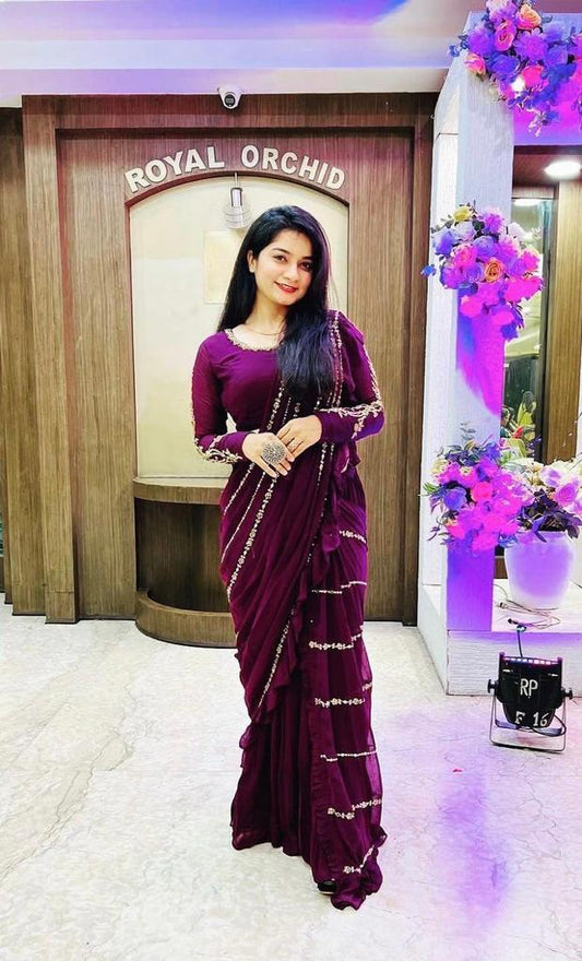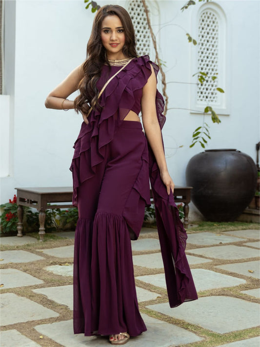 Purple Crepe Pre-draped Velvet Ruffle Saree