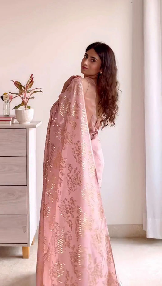 Powder Pink Saree In Organza With Foil Print And Embroidery
