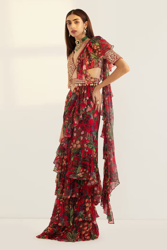 Multi-Colored Georgette Embroidered Pre-Pleated Saree Set