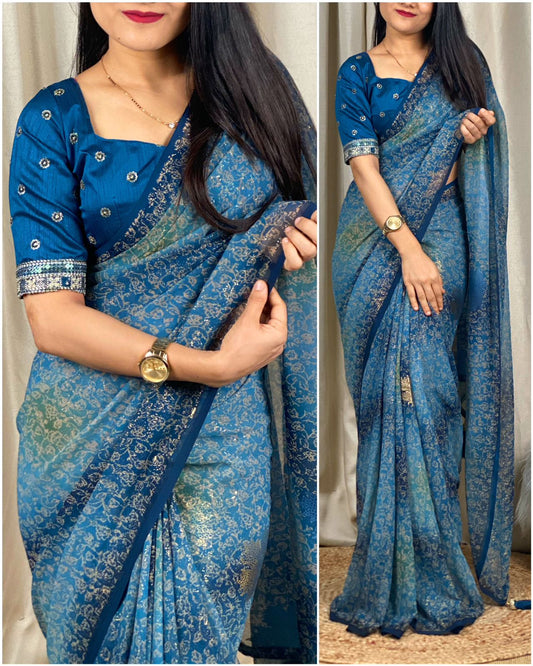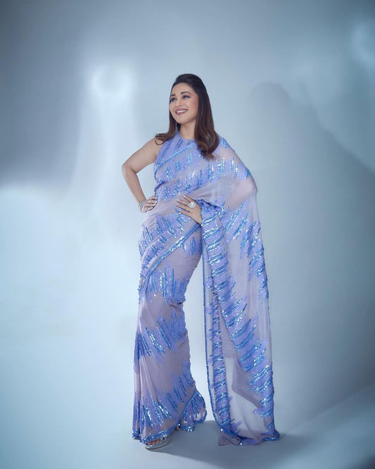 Pratham Blue Women's Sequins Georgette Fancy Saree