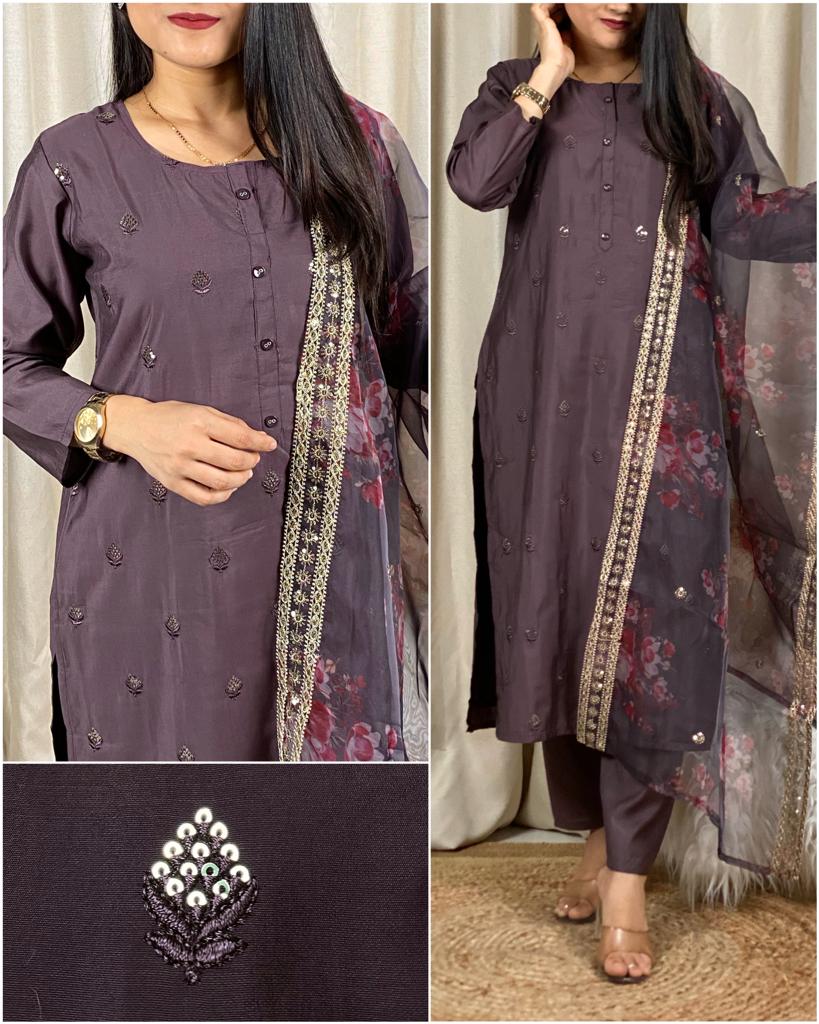 Organza Silk Party Wear Salwar Kameez in Purple and Violet with Thread work